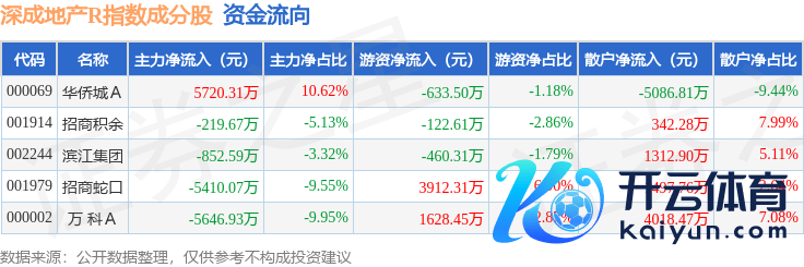 资金流向方面,深成地产R(471001)指数成份股当日主力资金净流出共计6408.94万元,游资资金净流入共计4324.34万元,散户资金净流入共计2084.6万元。成份股资金流向细目见下表: