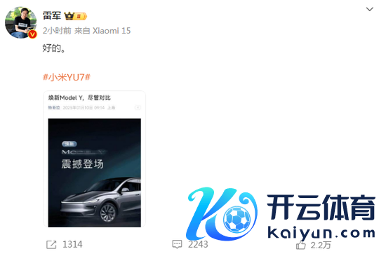 同期,特斯拉官微发布音书,宣传语为“焕新Model Y,尽管对比”。对此,小米创办东谈主、董事长兼CEO雷军发布微博称“好的”。据报谈,小米汽车第二款车型、首款SUV车型-YU7将于6月前后上市。